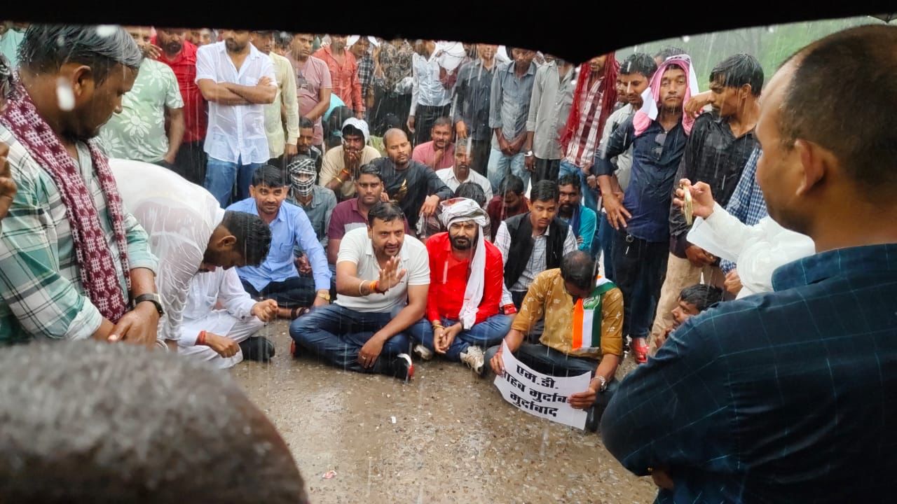 मुसलाधार बारिश गरजते बादल के बावजूद डेट रहे मजदूर और कांग्रेस कार्यकर्ता पंडरिया शक्कर कारखाना का किया जंगी घेराव