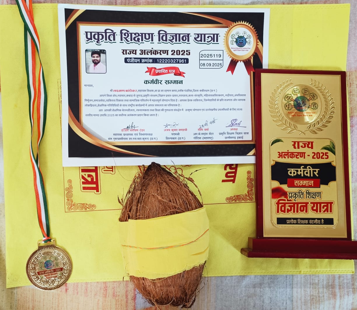 इस अवसर पर शासकीय प्राथमिक शाला रहमान कापा, कबीरधाम के शिक्षक लक्ष्मण बांधेकर को कर्मवीर अलंकरण सम्मान से अलंकृत किया। यह सम्मान शिक्षक बांधेकर को शिक्षा के क्षेत्र में नवाचार, वैज्ञानिक दृष्टिकोण के प्रसार, विज्ञान जागरूकता, जनसेवा तथा प्रकृति संरक्षण जैसे विविध क्षेत्रों में उल्लेखनीय योगदान के लिए प्रदान किया गया।