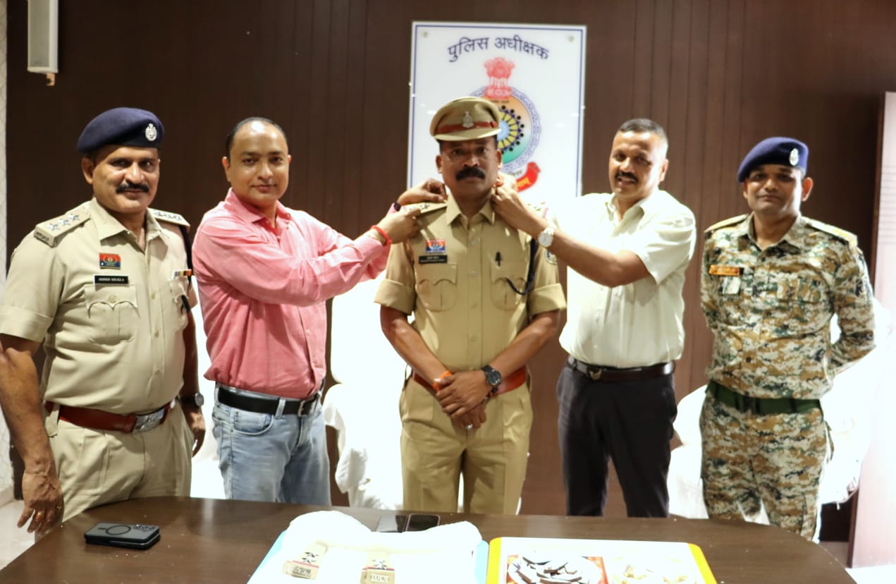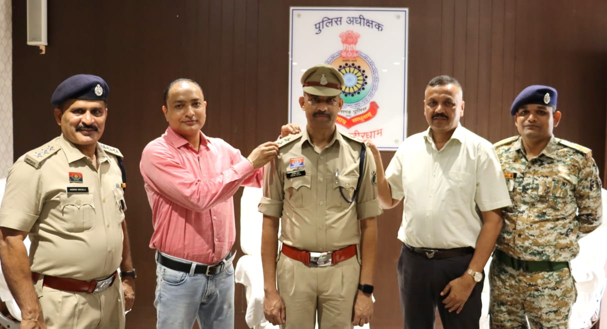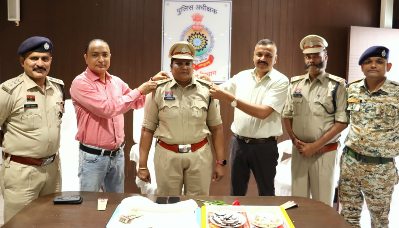 जिन्हें आज दिनांक 20 सितंबर 2025 को पुलिस अधीक्षक कार्यालय कबीरधाम में पुलिस अधीक्षक श्री धर्मेंद्र सिंह द्वारा पदोन्नत अधिकारी के एक कंधे पर स्टार लगाया गया तथा अतिरिक्त पुलिस अधीक्षक श्री पुष्पेंद्र बघेल द्वारा दूसरे कंधे पर स्टार लगाकर उन्हें सहायक उप निरीक्षक के पद से उप निरीक्षक के पद पर पदोन्नति प्रदान कर नई जिम्मेदारी सौंपी गई। इसके उपरांत पुलिस अधीक्षक ने पदोन्नत अधिकारी को मिष्ठान खिलाकर शुभकामनाएं दीं।
