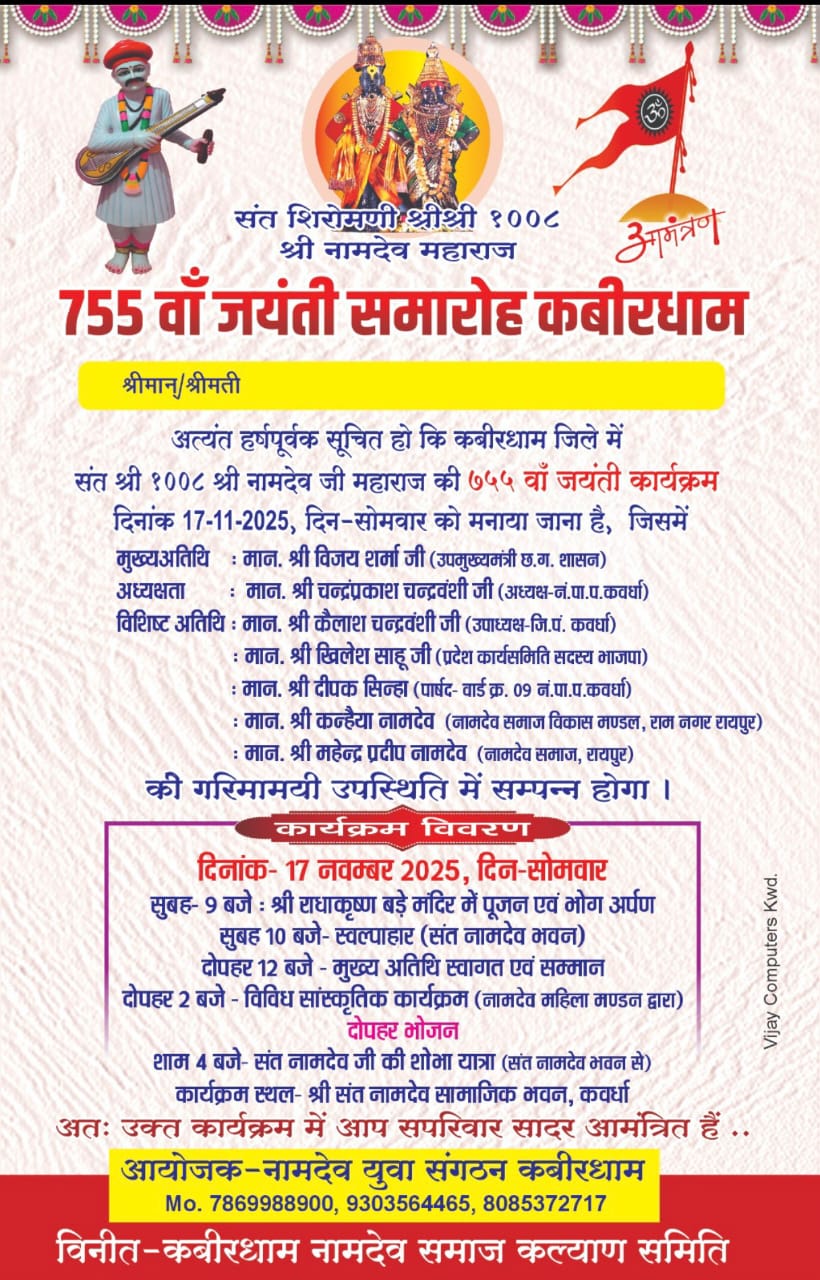कबीरधाम जिले के समस्त जिला नामदेव समाज द्वारा भव्य रूप से संत श्री नामदेव जी की 755 वी जयंती मनाई जा रही जिसमें यशस्वी उपमुख्यमंत्री माननीय कवर्धा विधायक श्री विजय शर्मा की उपस्थिति समाज के साथ रहेगी।