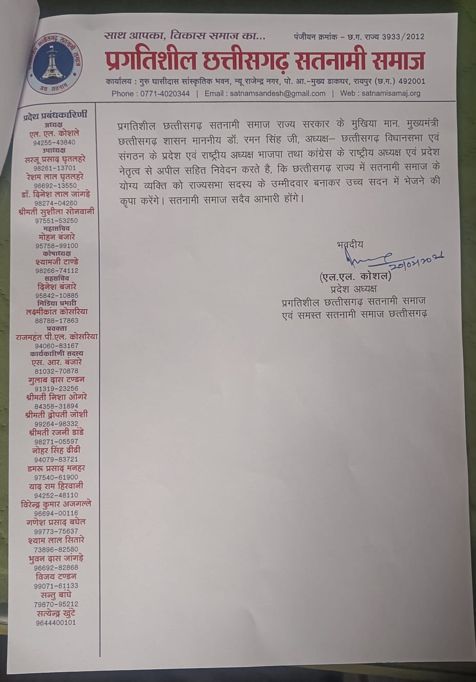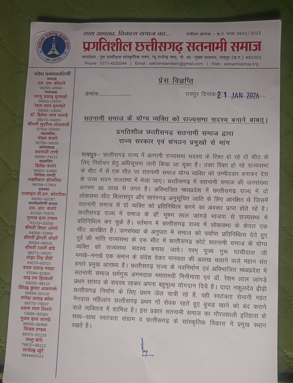 रायपुर –: छत्तीसगढ़ प्रगतिशील सतनामी समाज के अध्यक्ष श्री लखनलाल कोसले ह रायपुर प्रेस क्लब मं प्रेस कांफ्रेंस करके मांग करे हें कि छत्तीसगढ़ राज कोटा मं 2 पद राज्य सभा सांसद बर चुनाव के नोटिफिकेशन जारी हो गे हवय। एखर सेती छत्तीसगढ़ मं सतनामी समाज के जनसंख्या के अनुपात ला देखत कम से कम 1 सीट मं सतनामी समाज के प्रतिनिधि ला राज्य सभा सदस्य बनाय जाय।