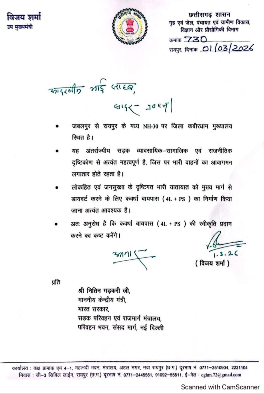 उप मुख्यमंत्री श्री शर्मा कहिन कि कवर्धा जिला मुख्यालय मं राष्ट्रीय राजमार्ग ऊपर 4-लेन बायपास बनाय जाय, अऊ चिल्फी (धवईपानी) ले सिमगा तक करीब 122 किलोमीटर लंबा एनएच-30 के हिस्सा ला 4-लेन मं उन्नयन करे जाय। ए बात ला गंभीरता ले सुनके केंद्रीय मंत्री श्री गडकरी संबंधित अधिकारी मन ला जरूरी कारवाही करे बर निर्देश दे हें।