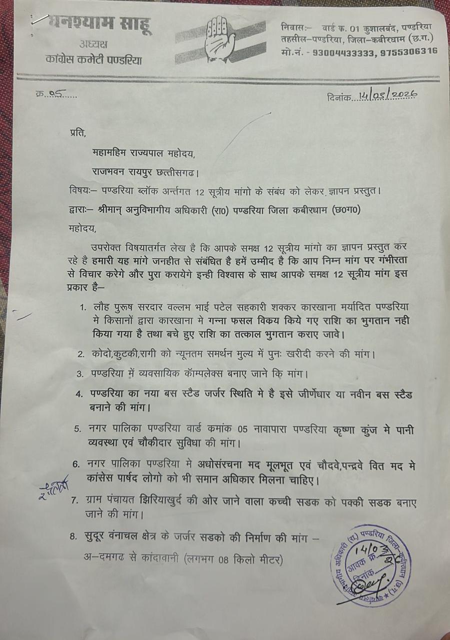 धरना-प्रदर्शन के बाद ये मांग पत्र जिला कलेक्टर अउ पुलिस अधीक्षक, कबीरधाम के नाम घलो सौंपे गीस। कार्यक्रम मं बड़ी संख्या मं कांग्रेस पदाधिकारी, कार्यकर्ता अउ क्षेत्र के नागरिक उपस्थित रहीन!