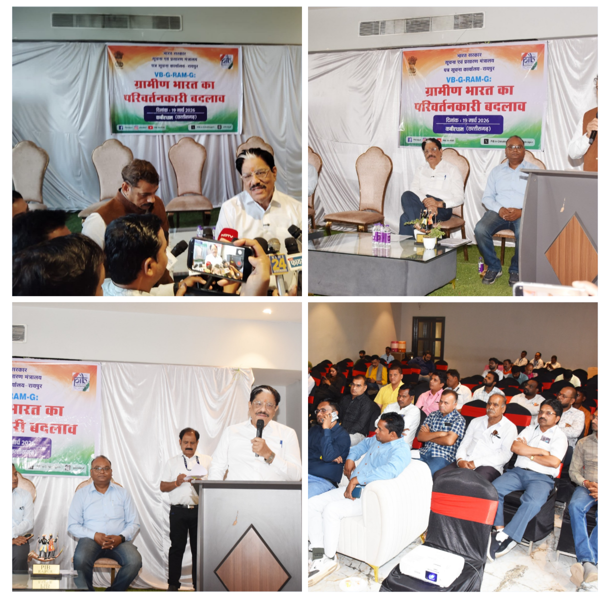 कवर्धा। कवर्धा के नारायणी होटल मं आज भारत सरकार के सूचना अउ प्रसारण मंत्रालय के पत्र सूचना कार्यालय रायपुर के द्वारा मिडिया कार्यशाला के आयोजन करे गीस। ए कार्यशाला मं भारत सरकार के महत्त्वपूर्ण योजना VB.G.RAM.G. ला 1 अप्रैल 2026 ले छत्तीसगढ़ मं लागू करे जाही, ओकर बारे मं पत्रकार मन ला जानकारी देय गीस।