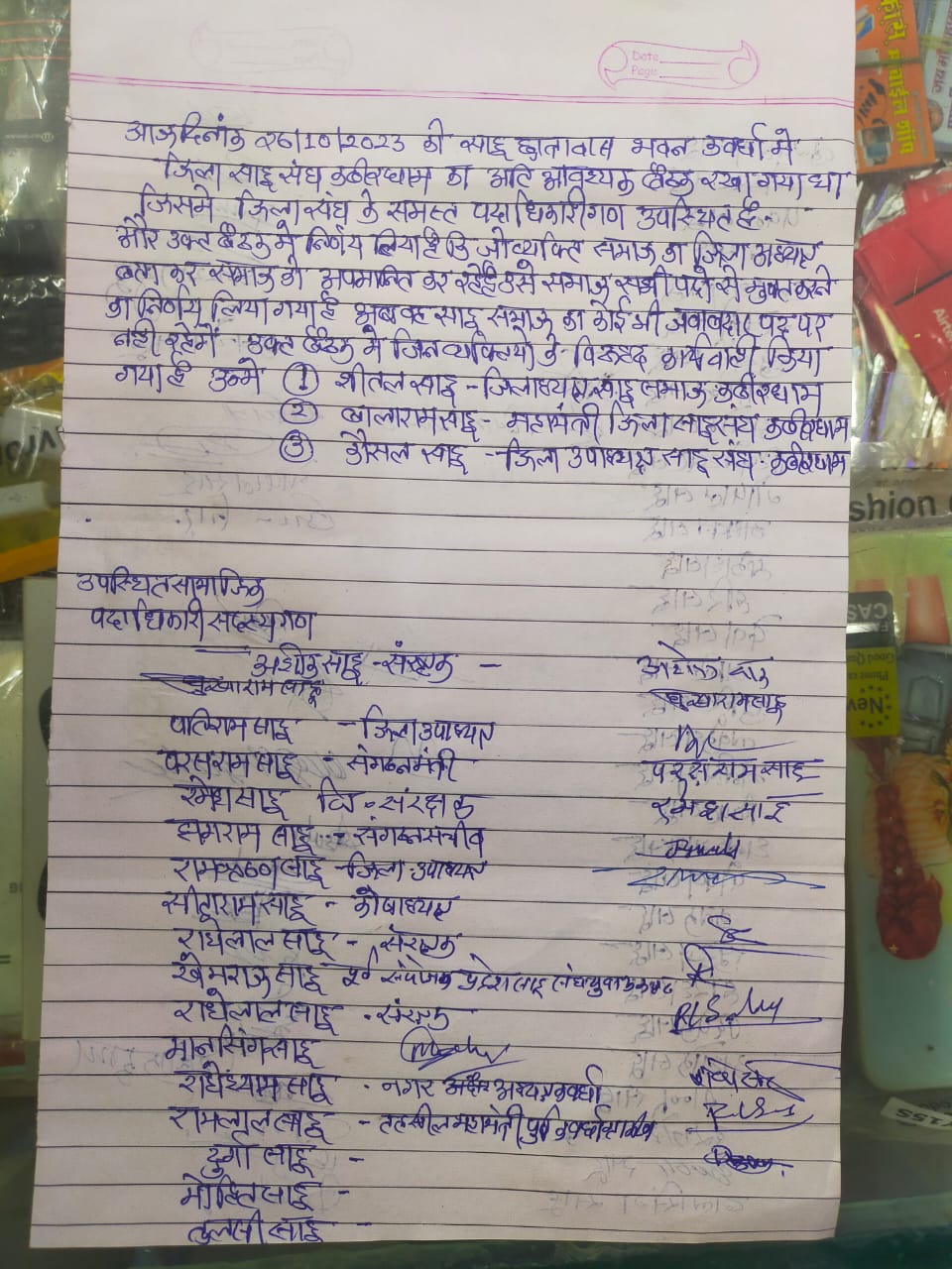 और समाज के तीनों प्रमुख ग्रहीता पदधारी शीतल साहू (जिला अध्यक्ष), बालाराम साहू (महामंत्री), कौशल साहू (उपाध्यक्ष) को सभी सामाजिक पद से हटाया जाना सही फैसला में समर्थन करते हुए निर्णय किया है।