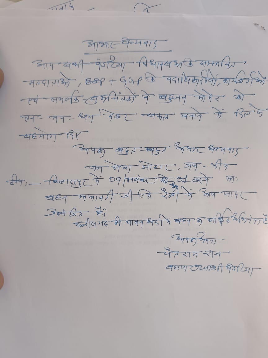चैतराम राज बसपा प्रत्याशी पंडरिया ने क्षेत्र के जनता का आभार जताया।