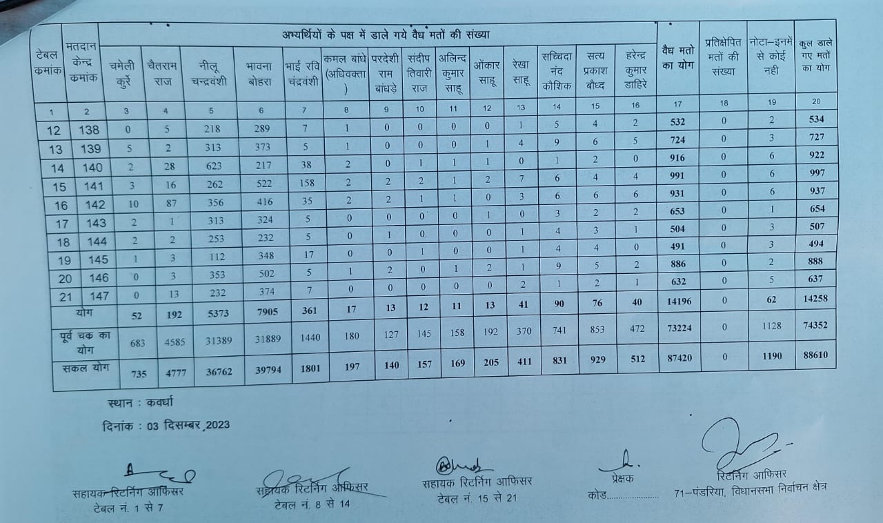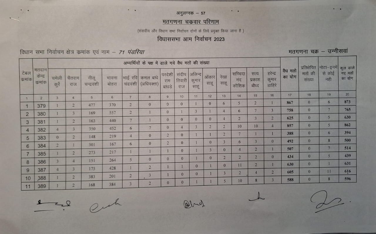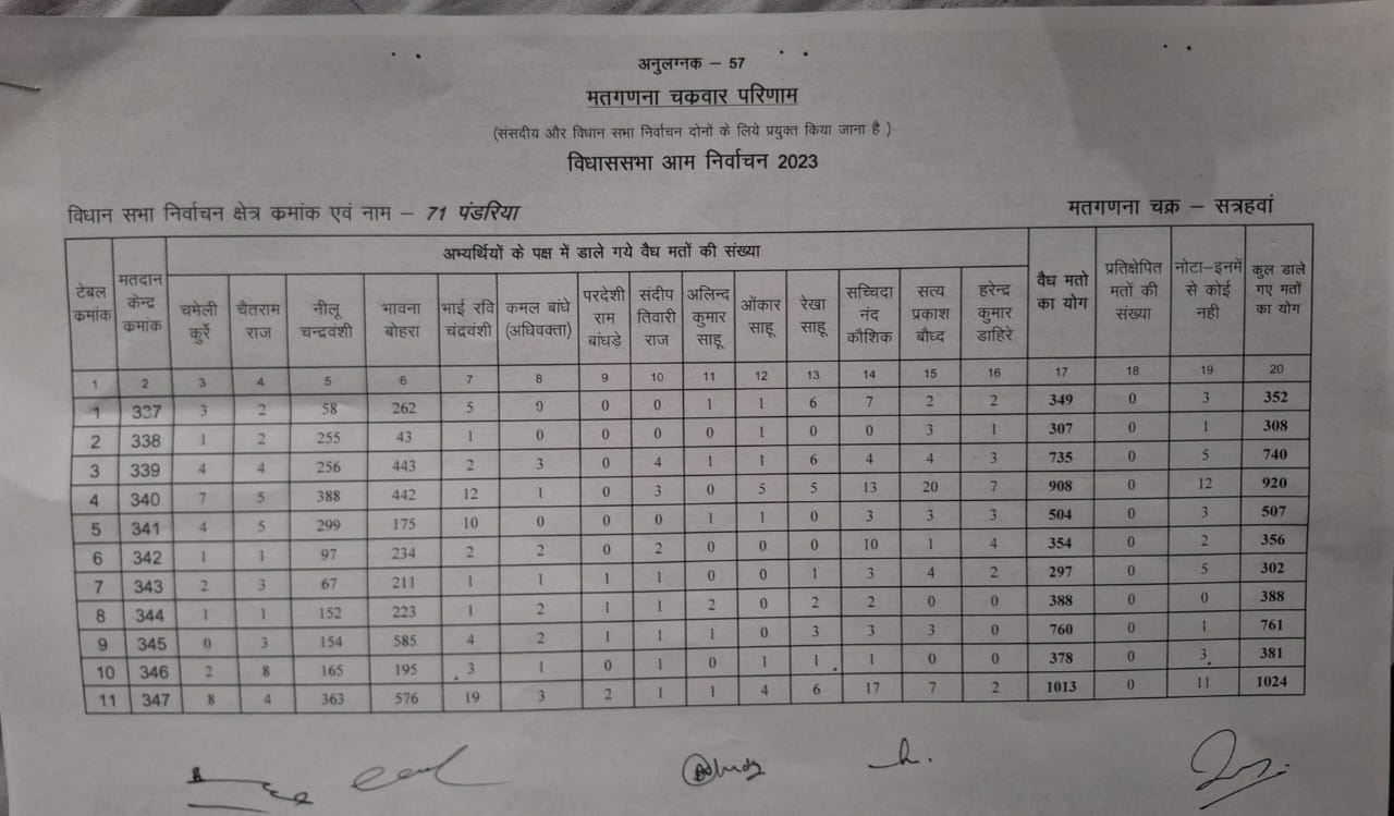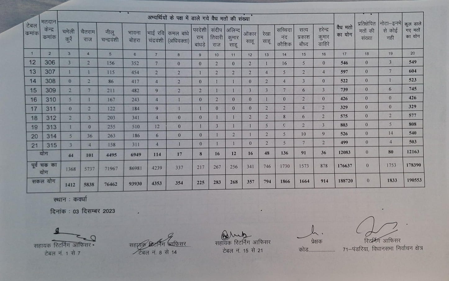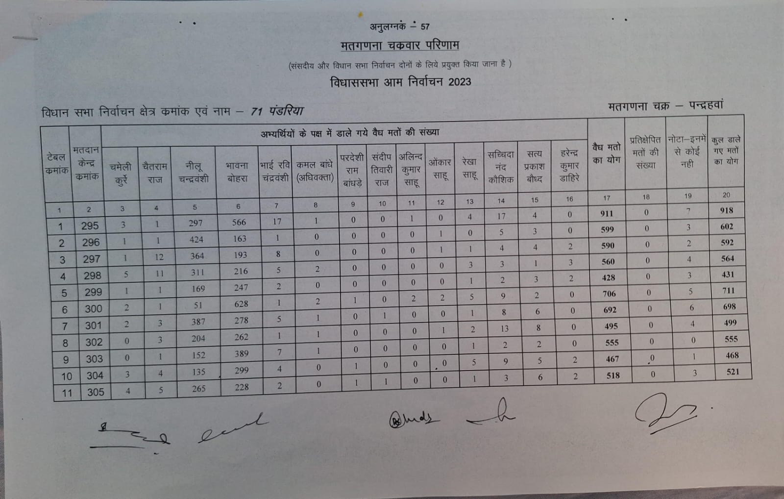 विधानसभा चुनाव 2023 के बुथवार चुनाव परिणाम पोलिंग बुथ 393 में प्रत्येक प्रत्याशी को कुल मतो की संख्या इस तरह मतदाता प्रदान किया है जिसमें सबसे ज्यादा भाजपा के प्रत्याशी भावना बोहरा को 1लाख44 हजार257 मत मिला तो दुसरे स्थान पर कांग्रेस के प्रत्याशी नीलू चन्द्रवंशी को 94 हजार 449 मत मिला वही तीसरे स्थान में बसपा प्रत्याशी चैतरामराज को 6214 मत तो छजका के रवि चन्द्रवंशी को 4783 मत प्राप्त कर चौथे स्थान पर रहे हैं शेष प्रत्याशी को बहुत कम मत मतदाता प्रदान किया है! इस तरह पंडरिया विधानसभा में कुल मत 2 लाख 36 हजार 378 मत पड़े हैं।
