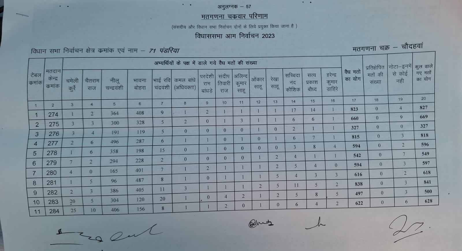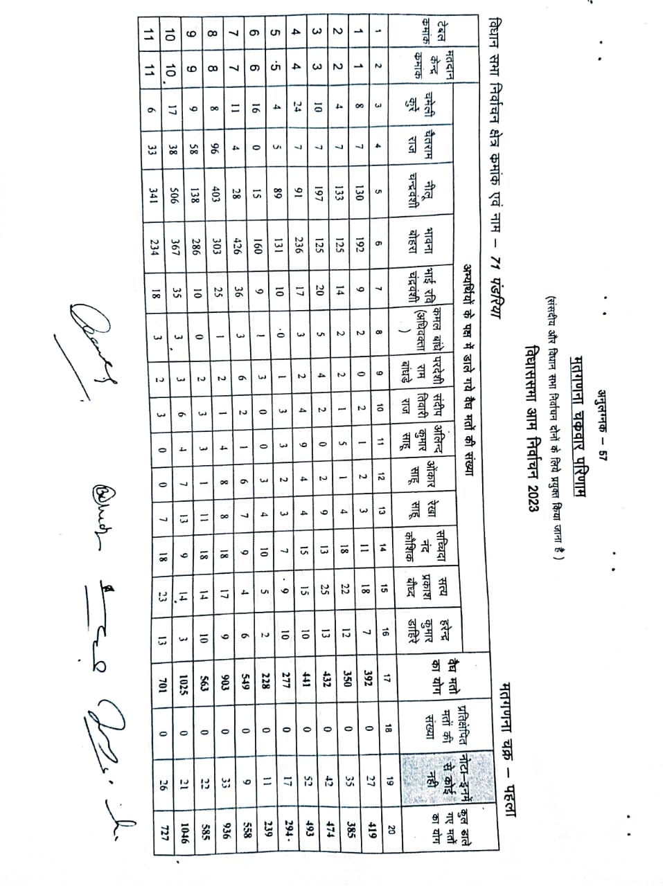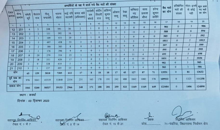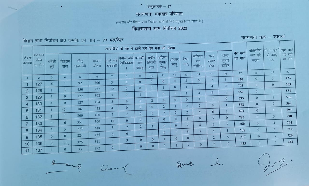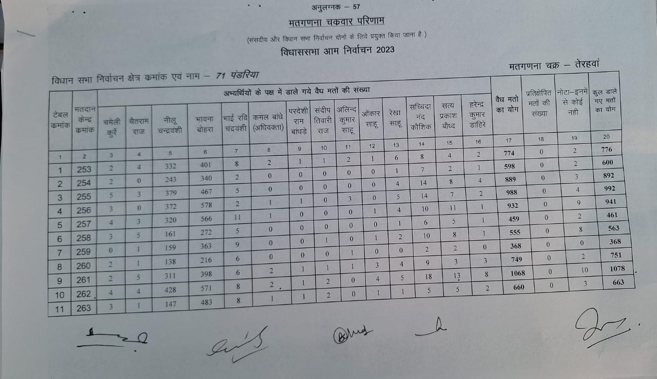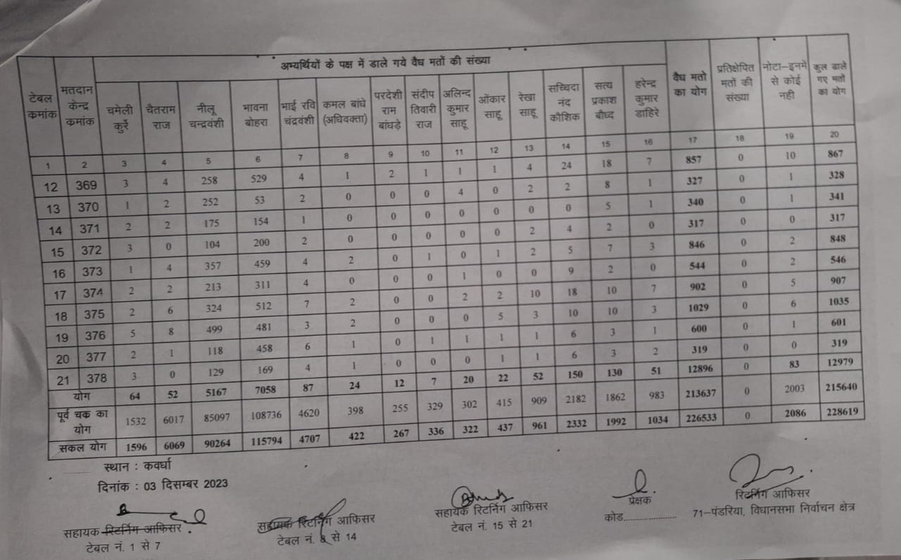 विधानसभा चुनाव 2023 के बुथवार चुनाव परिणाम पोलिंग बुथ 393 में प्रत्येक प्रत्याशी को कुल मतो की संख्या इस तरह मतदाता प्रदान किया है जिसमें सबसे ज्यादा भाजपा के प्रत्याशी भावना बोहरा को 1लाख44 हजार257 मत मिला तो दुसरे स्थान पर कांग्रेस के प्रत्याशी नीलू चन्द्रवंशी को 94 हजार 449 मत मिला वही तीसरे स्थान में बसपा प्रत्याशी चैतरामराज को 6214 मत तो छजका के रवि चन्द्रवंशी को 4783 मत प्राप्त कर चौथे स्थान पर रहे हैं शेष प्रत्याशी को बहुत कम मत मतदाता प्रदान किया है! इस तरह पंडरिया विधानसभा में कुल मत 2 लाख 36 हजार 378 मत पड़े हैं।