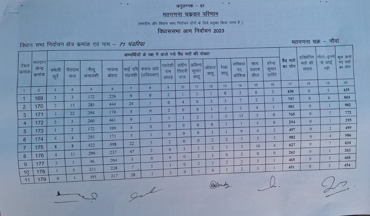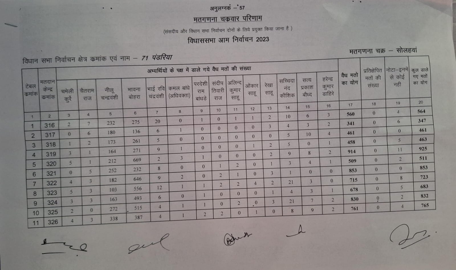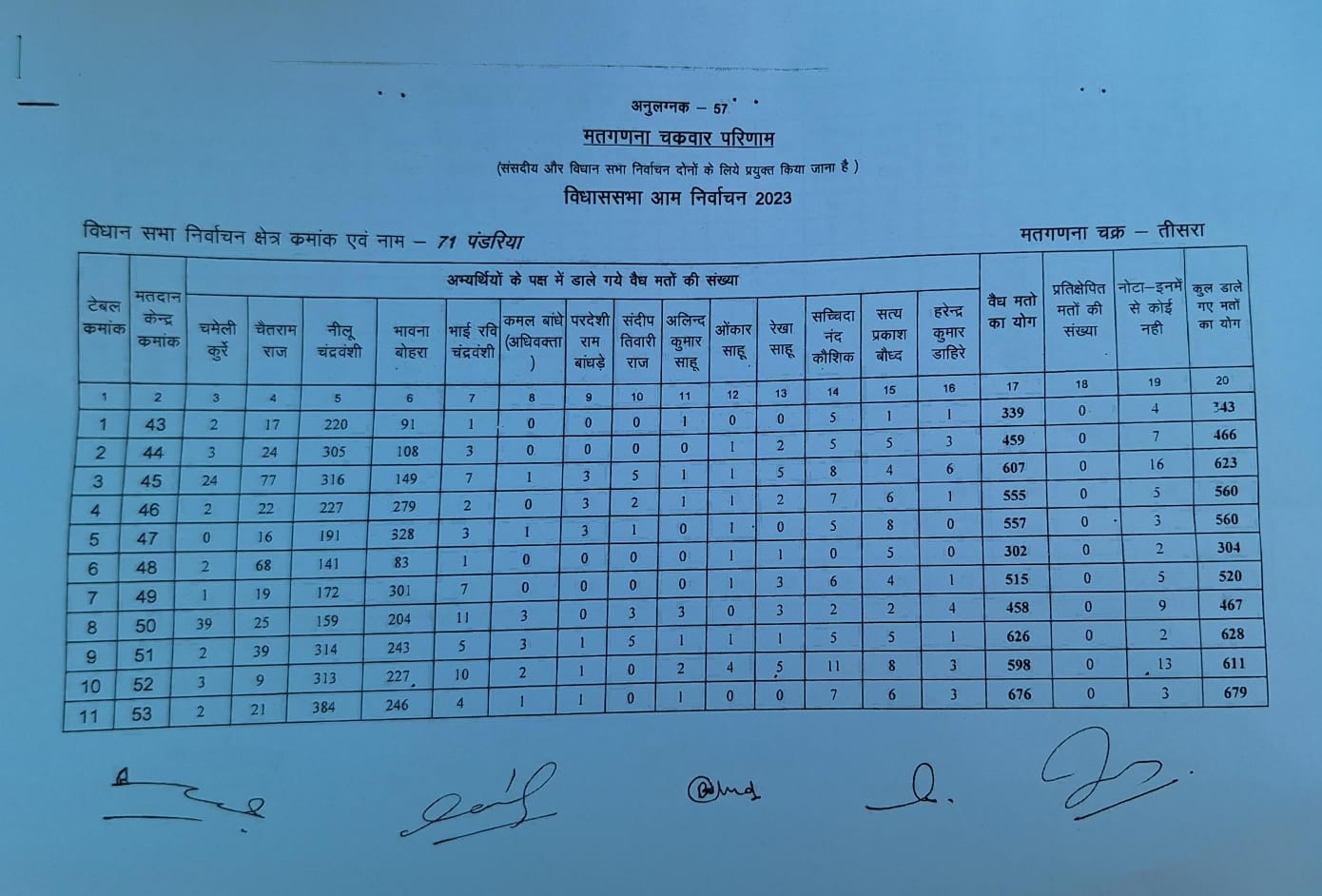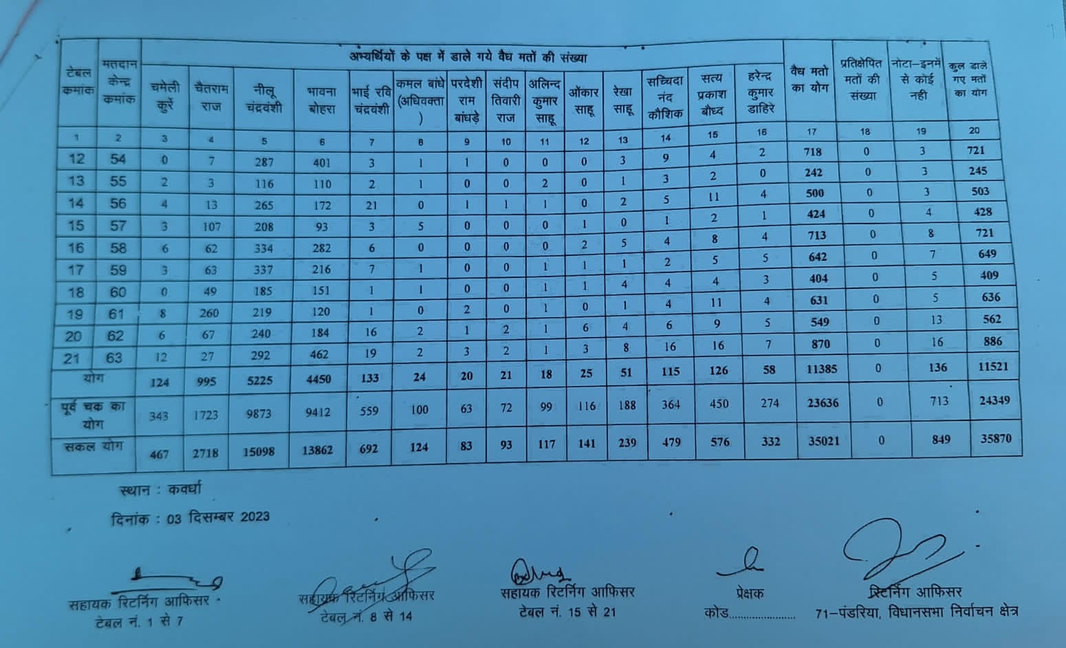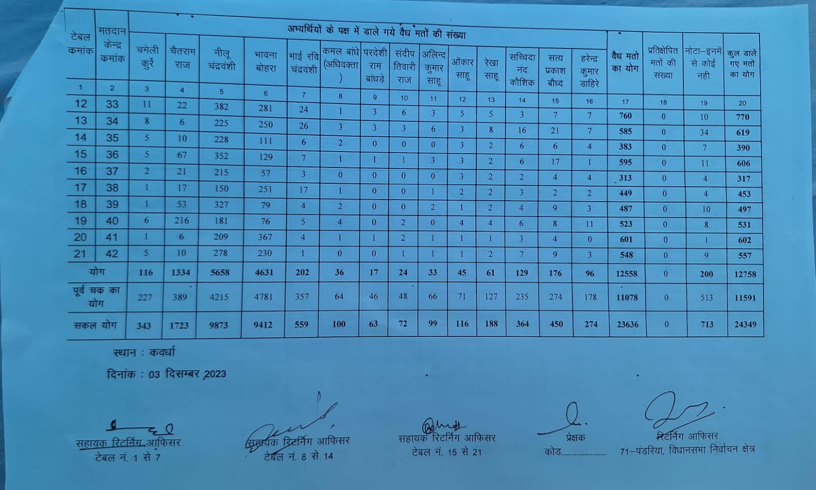 विधानसभा चुनाव 2023 के बुथवार चुनाव परिणाम पोलिंग बुथ 393 में प्रत्येक प्रत्याशी को कुल मतो की संख्या इस तरह मतदाता प्रदान किया है जिसमें सबसे ज्यादा भाजपा के प्रत्याशी भावना बोहरा को 1लाख44 हजार257 मत मिला तो दुसरे स्थान पर कांग्रेस के प्रत्याशी नीलू चन्द्रवंशी को 94 हजार 449 मत मिला वही तीसरे स्थान में बसपा प्रत्याशी चैतरामराज को 6214 मत तो छजका के रवि चन्द्रवंशी को 4783 मत प्राप्त कर चौथे स्थान पर रहे हैं शेष प्रत्याशी को बहुत कम मत मतदाता प्रदान किया है! इस तरह पंडरिया विधानसभा में कुल मत 2 लाख 36 हजार 378 मत पड़े हैं।