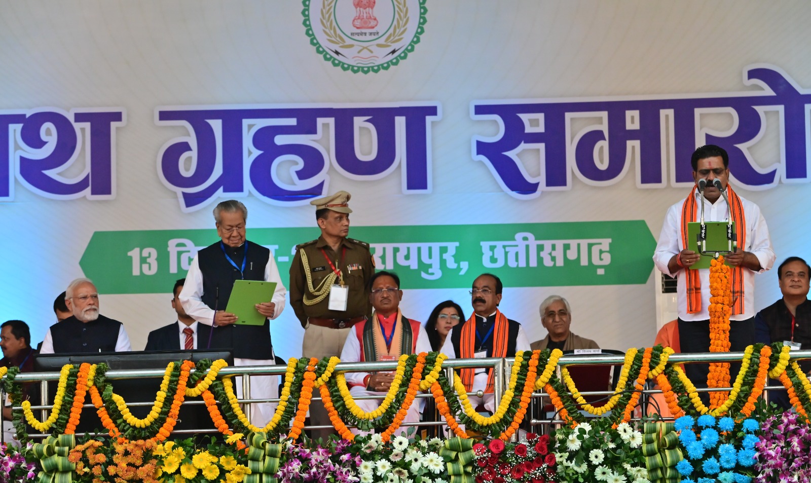 रायपुर, 13 दिसंबर 2023/ कवर्धा विधायक श्री विजय शर्मा ने आज छत्तीसगढ़ के उपमुख्यमंत्री पद की शपथ ली। प्रधानमंत्री श्री नरेंद्र मोदी की उपस्थिति में डिप्टी सीएम की शपथ ली। रायपुर के साइंस कॉलेज मैदान में विशाल जनसमूह के बीच राज्यपाल श्री विश्वभूषण हरिचंदन ने उन्हें पद एवं गोपनीयता की शपथ दिलाई।