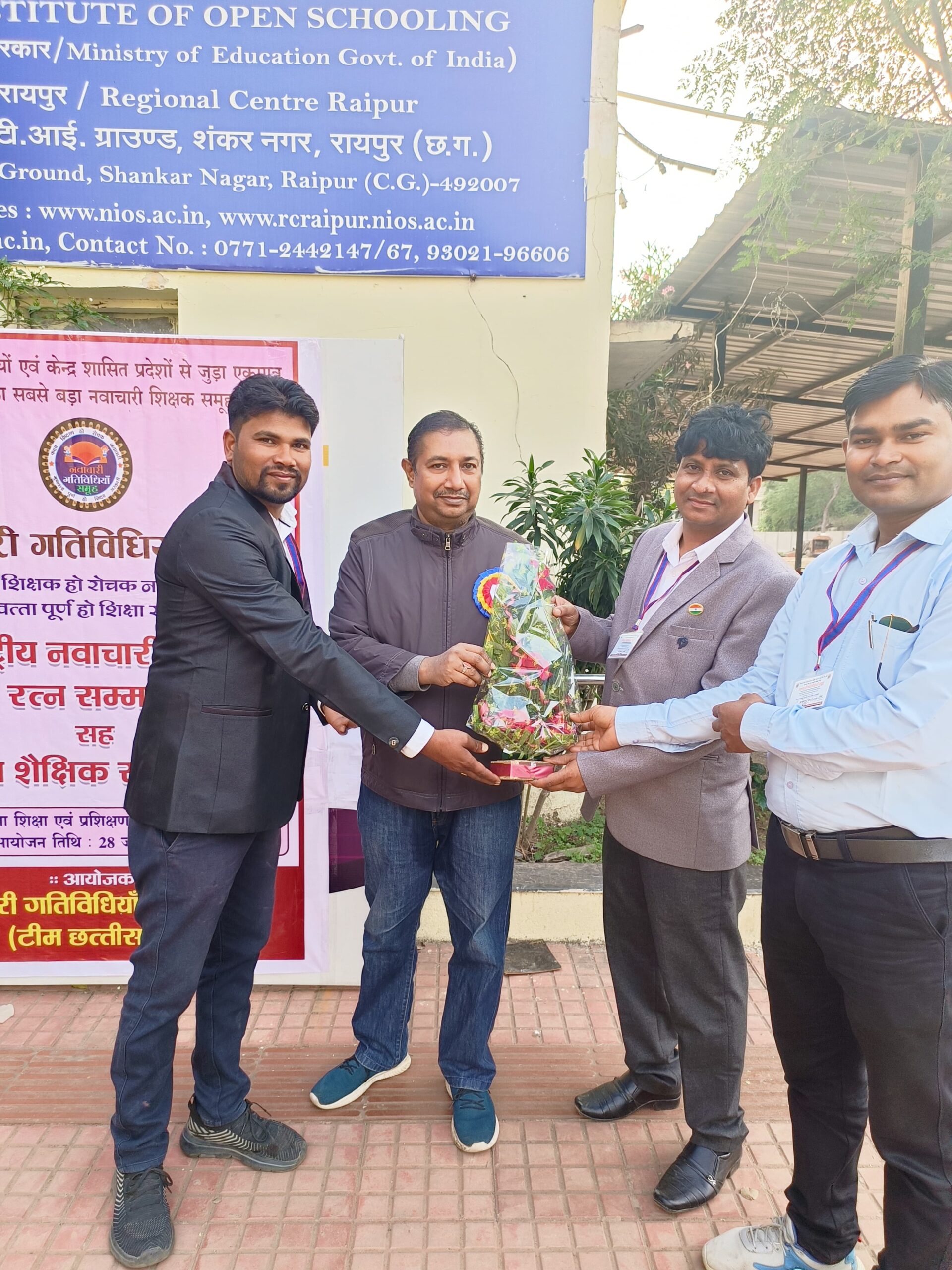 जिला टीम के सदस्य शिवकुमार बंजारे ने भी भाग लिया जिसे स्मृति चिन्ह भेंट कर सम्मानित किया गया। समूह प्रमुख संजीव सूर्यवंशी की टीम ने बताया कि इस कार्यक्रम का आयोजन कई चरणों के बाद अवार्ड के लिए छत्तीसगढ़ राज्य सहित अन्य राज्यों के शिक्षकों का चयन हुआ है। सर्वप्रथम इसके लिए गुगल फार्म से ऑनलाइन माध्यम से आवेदन प्राप्त किया गया। *पूरे देश से 700 से भी ज्यादा नॉमिनेशन प्राप्त हुए* जिसको स्कूटनी एवं शॉर्टलिस्ट कर चयन समिति द्वारा संबंधित शिक्षकों का साक्षात्कार लिया गया एवं सबंधित से उनके कार्यो के प्रमाण में दस्तावेज मांगे गए हैं। दस्तावेजों का उच्च चयन समिति एवं छ. ग. के जिला टीम के प्रमाणीकरण के पश्चात चयन सूची जारी किया है। जिसमें ग्राउंड लेवल पर उत्कृष्ट कार्य करने वाले शिक्षक शामिल हैं। जिनको राष्ट्रीय नवाचारी शिक्षा रत्न सम्मान 2023 से सम्मानित किया गया। राष्ट्रीय नवाचारी शिक्षा रत्न सम्मान प्राप्त होने पर जिले के शिक्षकों द्वारा बधाई एवं शुभकामनाएं दी गई।