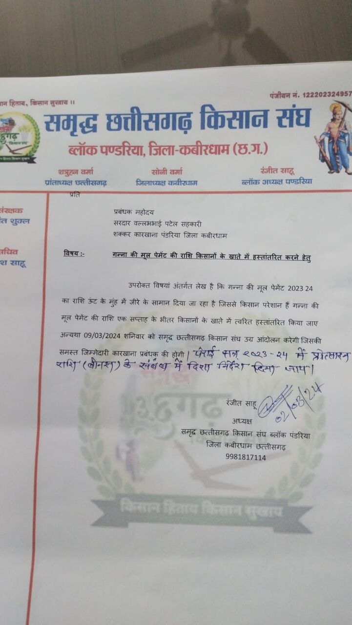 समृध्द छत्तीसगढ़ किसान संघ जिला कबीरधाम द्वारा सरदार वल्लभभाई पटेल सहकारी कारखाना पण्डरिया में किसानों के विभिन्न समस्याओ‌ का त्वरित निराकरण करने के लिए कारखाना प्रबंधक सतीश पटले(m.d.) के नाम पर ज्ञापन दिया गया।