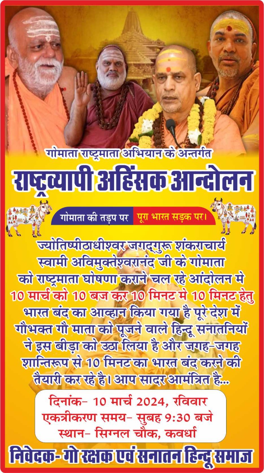 इसलिए इस मांग की पुर्ती कराने के लिए आज 10 मार्च को 10 बजे 10 मिनट के लिए भारत बंद कि आहवान शंकराचार्य ज्योतिष्पीठाधीश्वर व अविमुक्तेश्वरानंद स्वामी जी ने किया है इसके समर्थन में कवर्धा में बढ़ चढ़ कर हिस्सा लेते हुए तत्कालीन पंडरिया विधायक मोतीराम चन्द्रवंशी नगरपालिका कवर्धा नेता प्रतिपक्ष उमंग पांडेय पवन मिश्रा के अलावा बड़ी संख्या में सनातनी हिन्दू कवर्धा के एक्ता चौक में आंदोलन किया जहा तहसीलदार आंदोलन स्थल में पहुंच कर मोतीराम चन्द्रवंशी से प्रधानमंत्री मोदी के नाम गौमाता को राष्ट्र माता घोषित करने चुनावी मेनिफेस्टो में शामिल करने के लिए मांग पत्र सौंपा गया है।