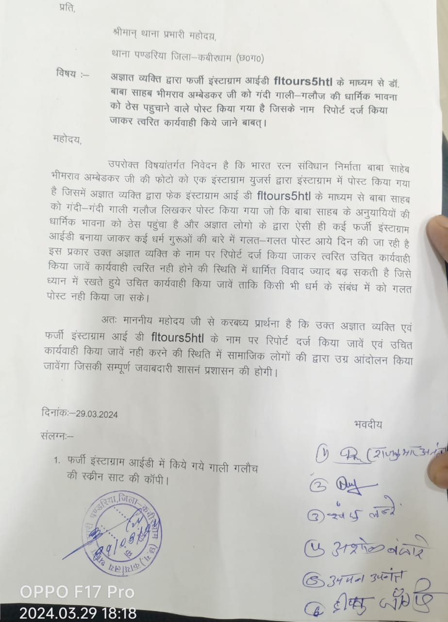 फिर हाल सोशल मिडिया के माध्यम से फिर भारत के संविधान रचने वाले बाबा साहेब डॉ भीमराव अम्बेडकर को गाली गलौज किया गया है जिनके खिलाफ पंडरिया थाना में बड़ी संख्या में अनुवाई उपस्थित होकर रिपोर्ट दर्ज करायें है और जल्द से जल्द दोषी के उपर कार्यवाही करने की मांग की गई है आवेदक में राजकुमार अनंत भागवत डाहिरे व युवा वर्ग शामिल हुए !