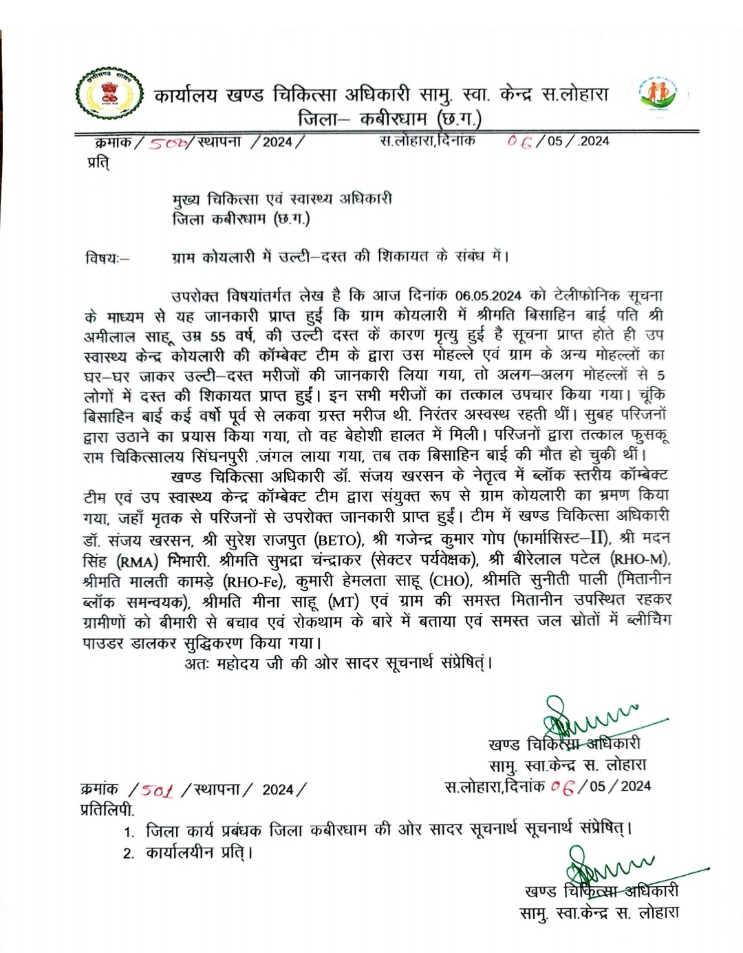 सहसपुर लोहारा -: विकास खण्ड सहसपुर लोहारा के आश्रित ग्राम कोयलारी में दिनांक 6/5/2024 को खंण्ड चिकित्सा अधिकारी डॉ.संजय खरसन को दुरभाष से सुचना प्राप्त हुआ ग्राम कोयलारी निवासी बिसाहिन बाई पति अमिलाल साहु उम्र 55 वर्ष की डायरीया से हालात खराब है।
