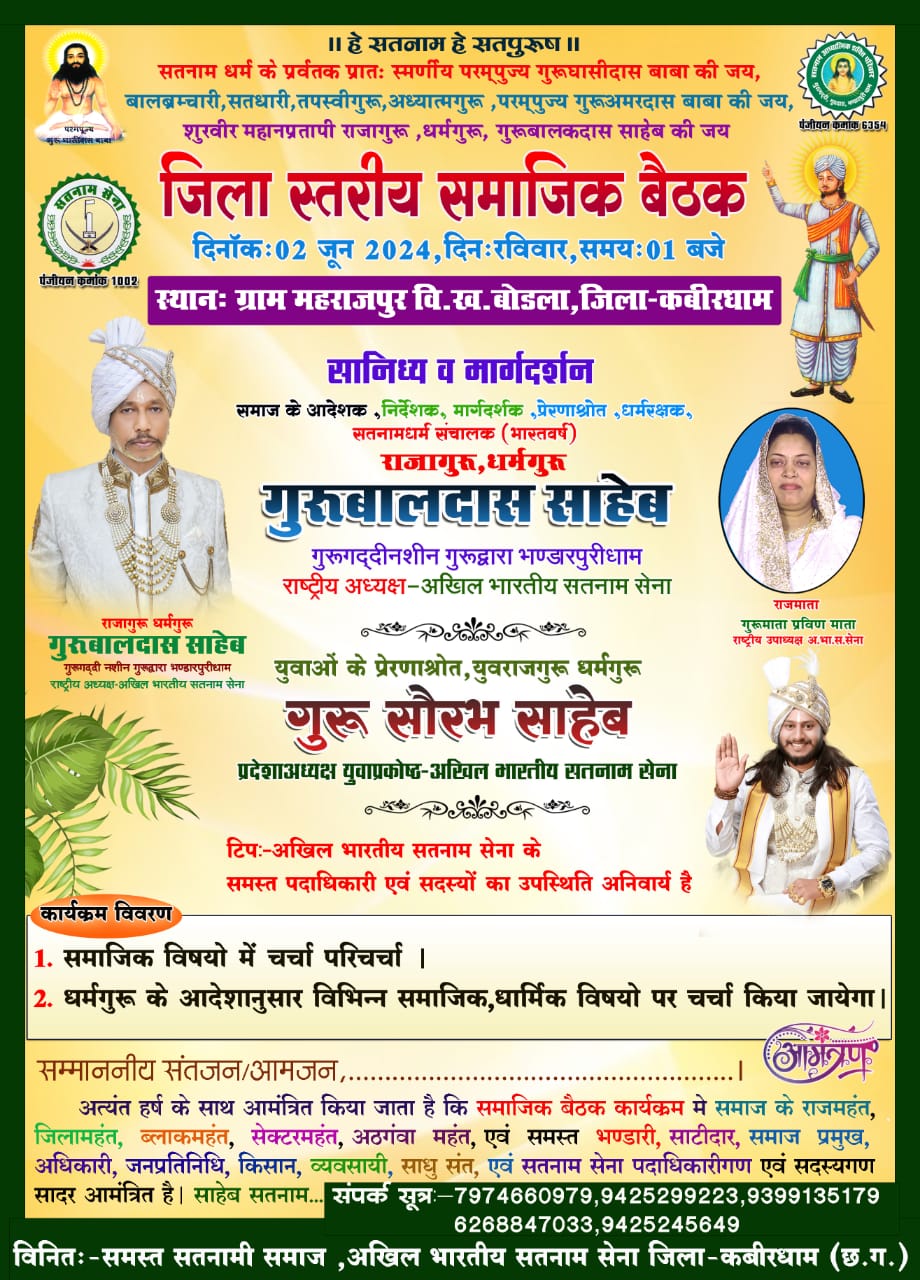 गुरु बालदास साहेब सतनामी समाज को धार्मिक रुप से संगठित करने लगातार छत्तीसगढ़ के अलावा देश भर के सतनाम पंथ के अनुवाई को सतनाम पंथ के रिती निती खानी बानी में चल कर समाज को मजबूत करने का मुहिम चला रहे हैं जीसे समाज भरपूर समर्थन कर रहे हैं इसी कड़ी में 2 जुन को महाराजपुर में जिला भर से छड़ीदार भंडारी महंत राजमहंत के अलावा सतनाम सेना भी बड़ी संख्या में सतनामी समाज को बैठक में शामिल होने आमंत्रित किया गया है।