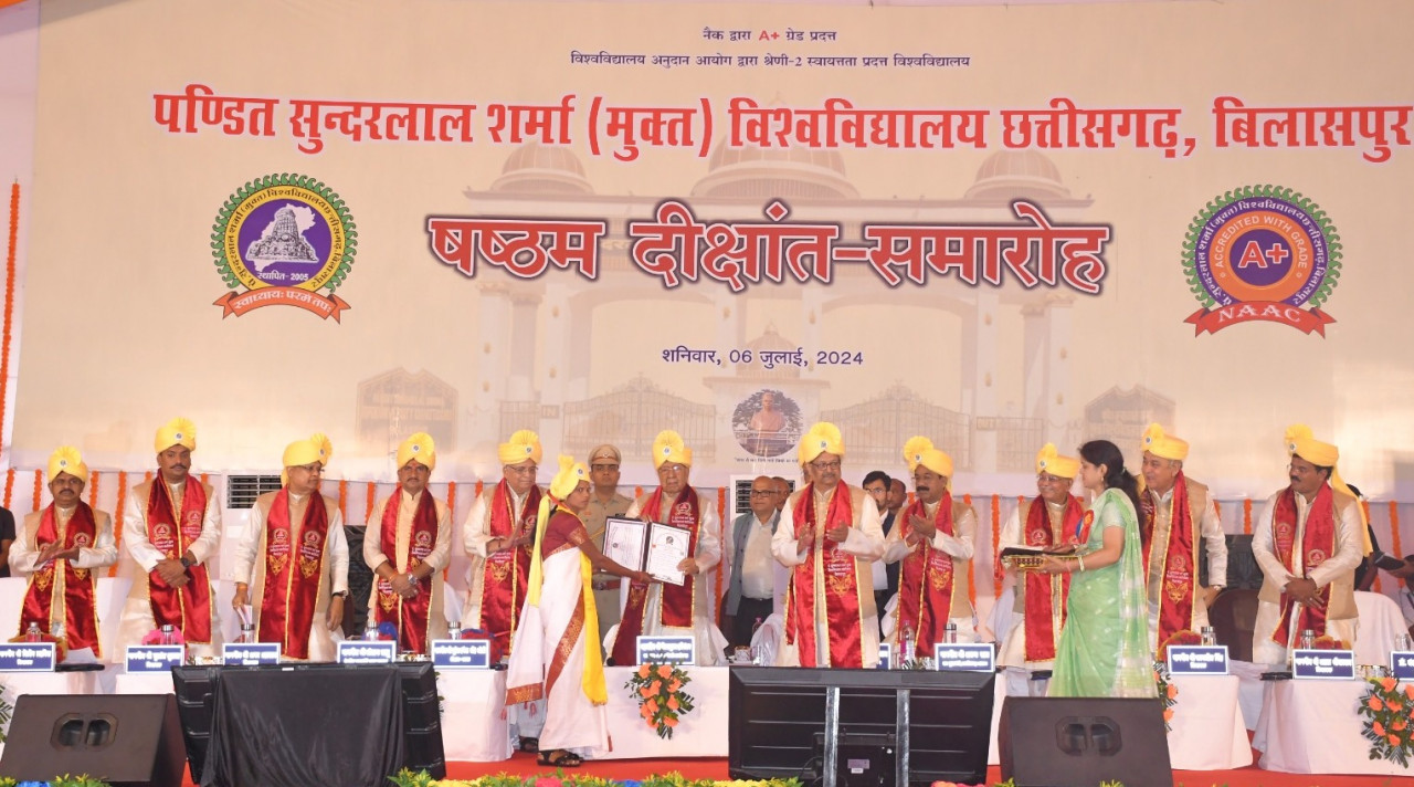 राज्यपाल श्री विश्व भूषण हरिचंदन एवं मुख्यमंत्री श्री विष्णु देव साय आज पंडित सुंदरलाल शर्मा मुक्त विश्वविद्यालय के छठवें दीक्षांत समारोह में शामिल हुए। दीक्षांत समारोह में विभिन्न सत्रों की परीक्षाओं में छात्रों को स्नातक, स्नातकोत्तर, डिप्लोमा, पात्रोपधि के लिए उपाधि एवं स्वर्ण पदक प्रदान किया गया। इस मौके पर श्री राम प्रताप सिंह एवं सुश्री सुरभा देश पांडे को विद्या वाचस्पति की मानद उपाधि दी गई। समारोह में कुलाधिपति द्वारा पीएचडी छात्रों को उपाधि प्रदान की गई एवं इस उपाधि के आचार एवं गौरव की रक्षा करने के संदेश दिए गए। अतिथियों ने उपाधि प्राप्त करने वाले छात्रों को अग्रिम भविष्य के लिए बधाई एवं शुभकामनाएं दी।