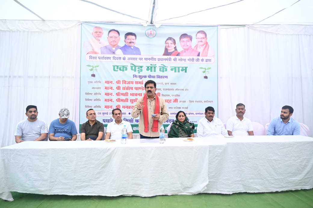उपमुख्यमंत्री श्री विजय शर्मा ने कहा कि प्रकृति को हरा भरा बनाना है, एक पेड़ मां के नाम लगाना है। उन्होंने बताया कि प्रधानमंत्री श्री नरेन्द्र मोदी द्वारा 05 जून को विश्व पर्यावरण दिवस के अवसर पर एक-पेड़ मॉं-के-नाम प्रारंभ किया गया है। जो मूलतः वृक्षारोपण अभियान है। इस अभियान के तहत् देश में सितंबर 2024 तक 80 करोड़ एवं मार्च, 2025 तक 140 करोड़ वृक्षों के रोपण का लक्ष्य प्रस्तावित है। भारत सरकार, पर्यावरण, वन एवं जलवायु परिवर्तन मंत्रालय द्वारा इसके लिए उमतपसपमिण्दपबण्पद नामक वेबपोर्टल तैयार किया गया है, जिसमें अभियान संबंधी जानकारी की नियमित प्रविष्टि की जा रही है।