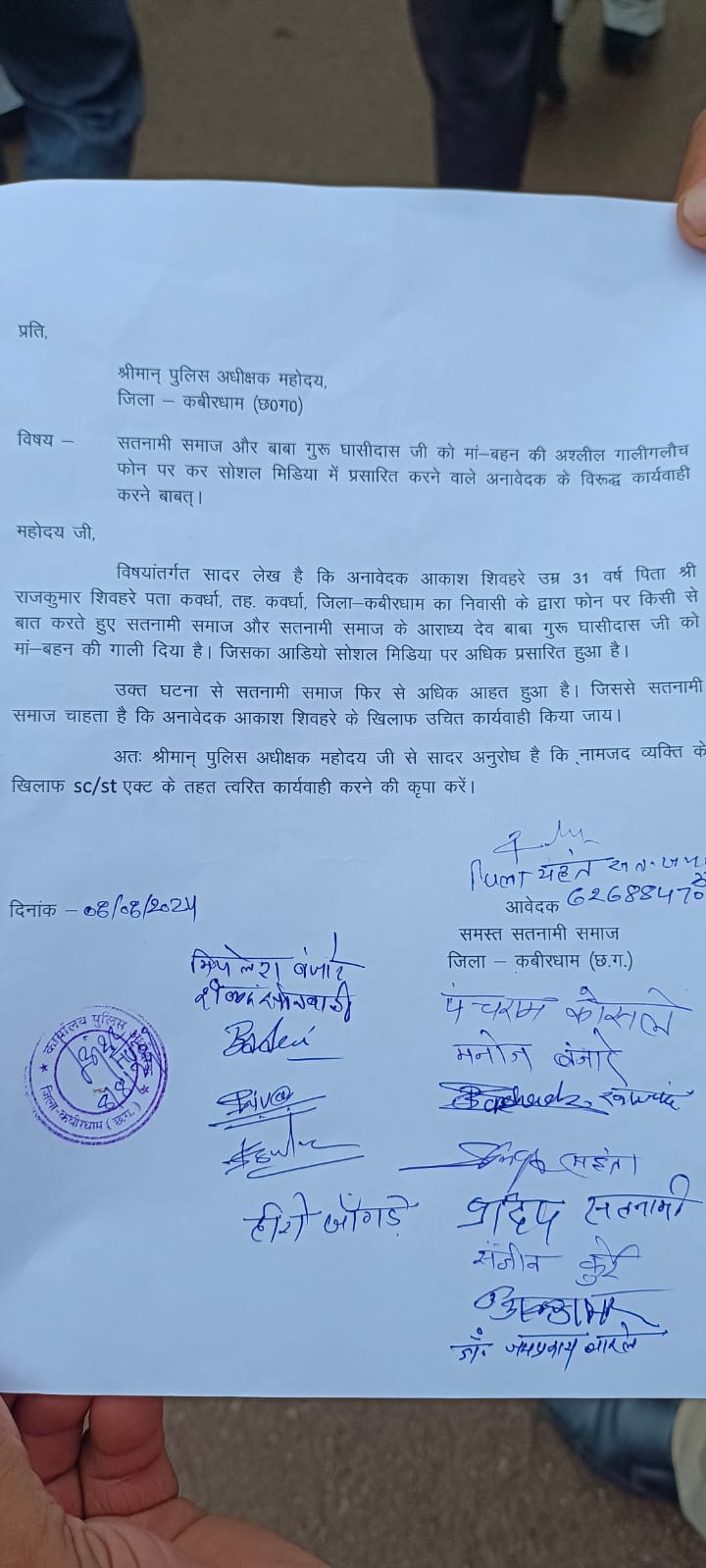 आरोपी के विरुद्ध कार्यवाही हेतु एडिशनल एसपी को सतनामी समाज के द्वारा ज्ञापन सौपा गया वह जल्द से जल्द आरोपी को गिरफ्तार कर कड़ी से कड़ी सजा दी जावे यदि आरोपी के खिलाफ किसी भी प्रकार के कोई कार्रवाई नहीं होने की स्थिति में सतनामी समाज जिला कबीरधाम उग्र आंदोलन करने के लिए बाध्य रहेगा जिसकी संपूर्ण जवाबदारी पुलिस प्रशासन व शासन प्रशासन की होगी!!