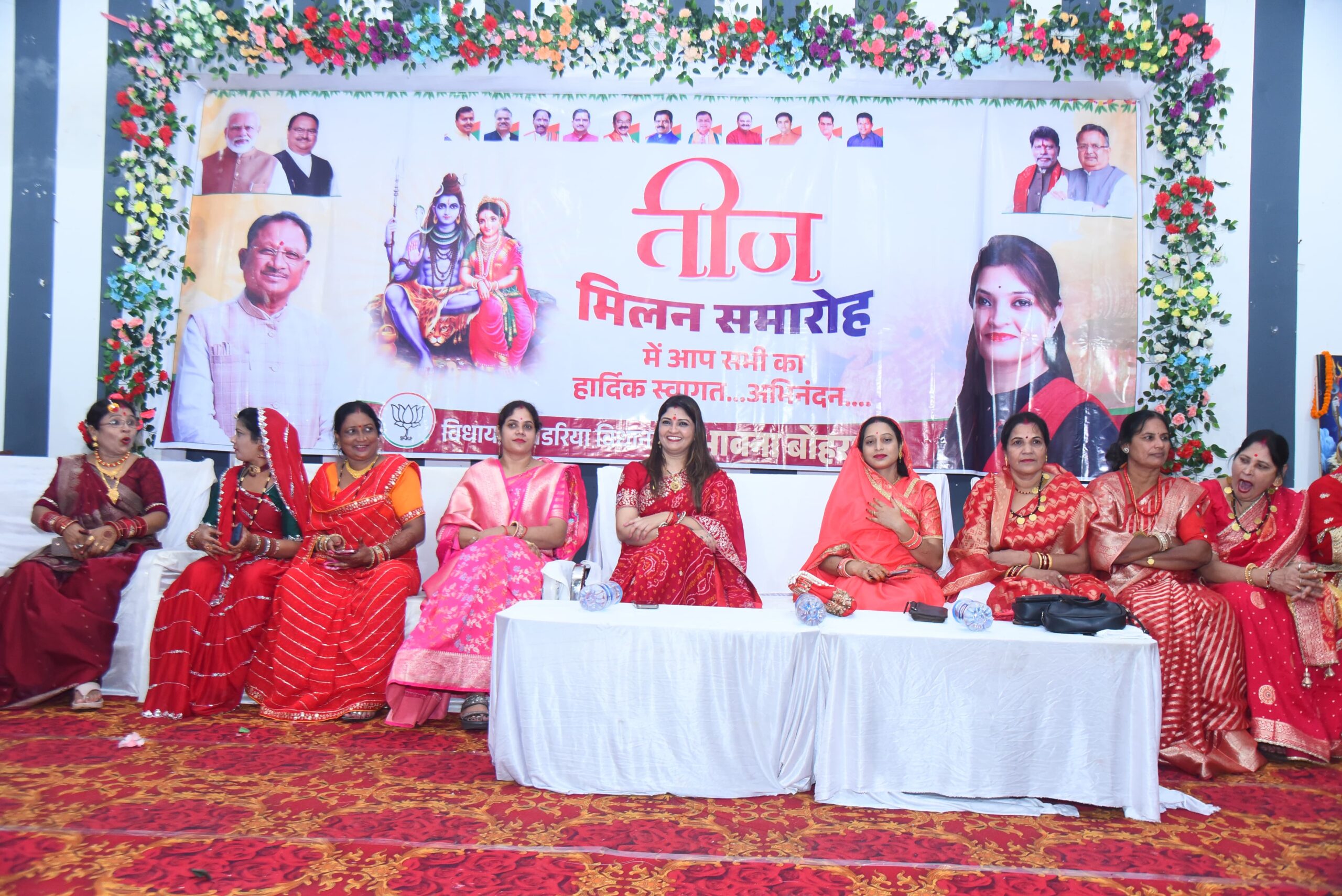 इस अवसर पर भावना बोहरा ने कहा कि यह बहुत खुशहाली का अवसर है। तीजा पर्व हमारी समृद्ध संस्कृति,परंपरा एवं नारी शक्ति के प्रतीक पर्व के रूप में बड़े ही उल्लास के साथ मनाया जाता है। तीजा में सुहागन महिलाएं निर्जला व्रत रखकर अपने पति की दीर्घायु जीवन की कामना लेकर शिव-पार्वती की पूजा करती हैं। उन्होंने कहा कि हमारे धर्म में मान्यता है कि “यत्र नार्यस्तु पूज्यन्ते, रमन्ते तत्र देवता” इसी मान्यता का अनुसरण करते हुए छत्तीसगढ़ की भाजपा सरकार महिलाओं को हर महीने महतारी वंदन योजना की राशि जारी कर रही है।