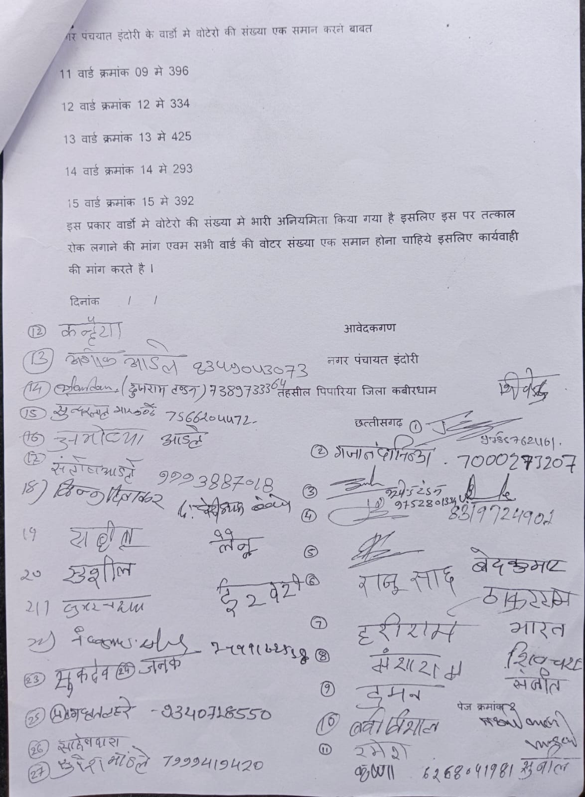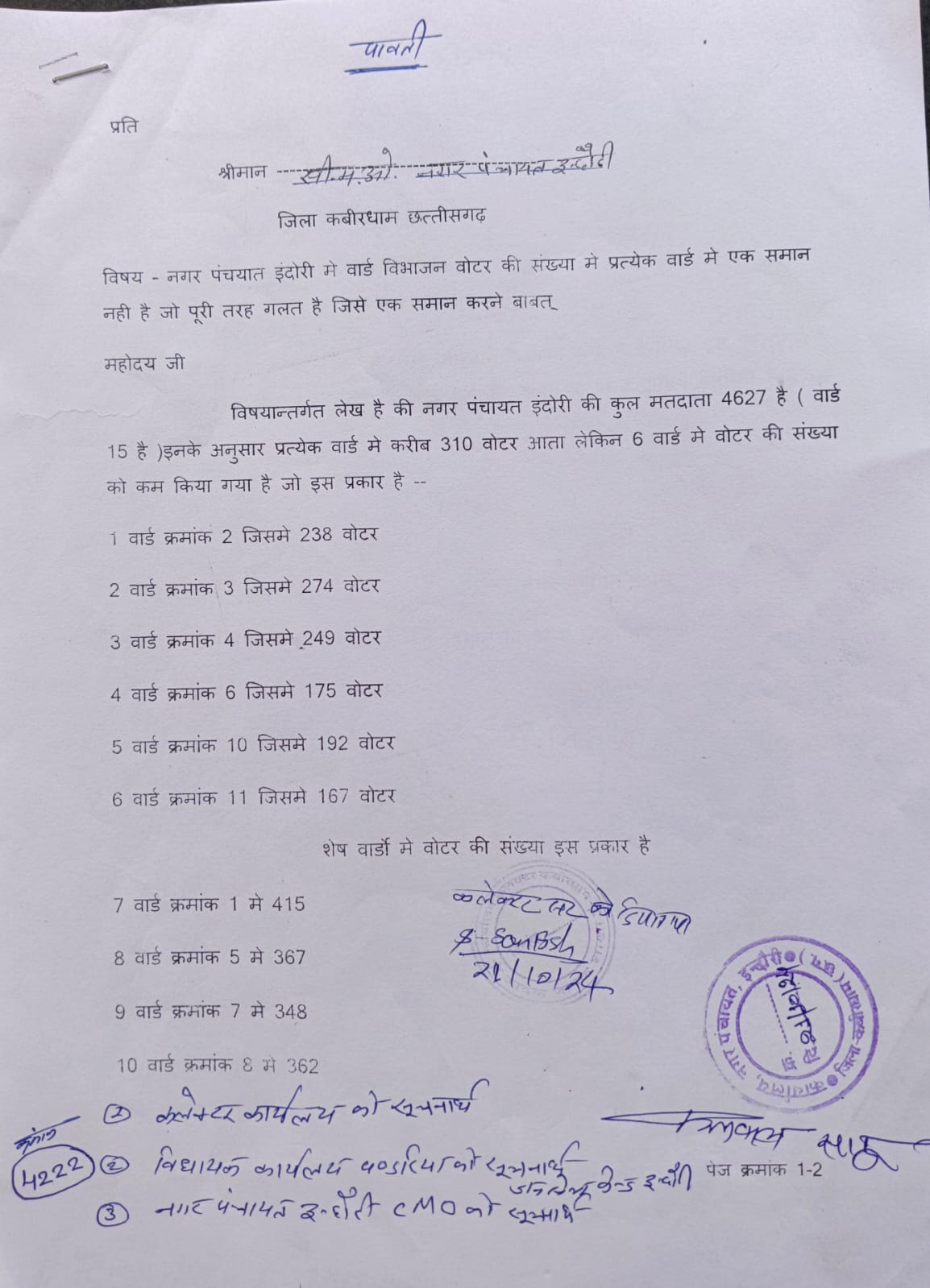 वार्ड विभाजन में वोटर की संख्या में प्रत्येक वार्ड में एक समान नहीं है, जो पूरी तरह से गलत है। नगर पंचायत में 15 वार्ड में मतदाता की कुल 4627 जनसंख्या निवासरत है। प्रत्येक वार्ड में करीब 310 वोटर आता है, लेकिन वार्ड क्रमांक 2 जिसमें 238 वोटर, वार्ड क्रमांक 3 में 274 वोटर, वार्ड क्रमांक 4 में 249 वोटर, वार्ड क्रमांक 6 में 175 वोटर, वार्ड क्रमांक 10 में 192 वोटर, वार्ड क्रमांक 11 में 167 वोटर है। इस प्रकार 6 वार्डों में वोटर की संख्या को कम किया गया है। शेष वार्डों में वोटर की संख्या अधिक है। वार्ड क्रमांक 1 में 415 वोटर, वार्ड क्रमांक 5 में 367 वोटर वार्ड क्रमांक 7 में 348, वार्ड क्रमांक 8 में 362, वार्ड क्रमांक 9 में 396, वार्ड क्रमांक 12 में 334, वार्ड क्रमांक 13 में 425, वार्ड क्रमांक 14 में 293, वार्ड क्रमांक 15 में 392 है। इस प्रकार वार्ड में वोटर की जनसंख्या में भारी अनियमिता किया गया है। इसलिए नगरवासियों ने इस पर आपत्ति लगाया है और कलेक्टर से तत्काल रोक लगाने की मांग की है। ज्ञापन सौंपते समय जनपद सदस्य प्रतिनिधि गजानन सिन्हा, सुंदरलाल मारकंडे, भूपेंद्र टंडन, योगेश्वर सिंह, हरी आडले, मनसा कोसले, जोगेंद्र चंद्रवंशी, बद्री विशाल चंद्रवंशी, महंगी, गीत लहरे, संतोष सहित अन्य उपस्थित रहे।