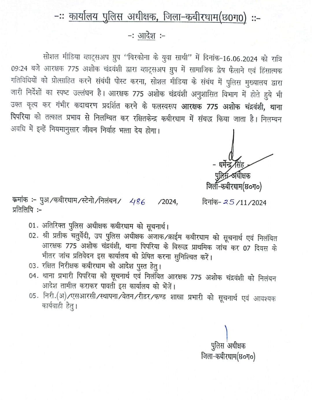 पुलिस अधीक्षक कबीरधाम **श्री धर्मेंद्र सिंह (IPS)** ने मामले की गंभीरता को देखते हुए आरक्षक अशोक चंद्रवंशी को तत्काल प्रभाव से निलंबित कर विभागीय जांच के आदेश दिए हैं। जांच के उपरांत कदाचार में दोषी पाए जाने पर उनके विरुद्ध कठोरतम अनुशासनात्मक कार्रवाई सुनिश्चित की जाएगी।
