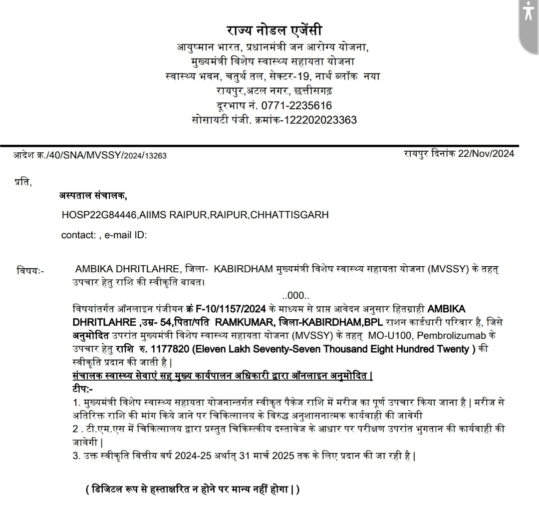 दीदी भावना बोहरा को आवेदन मिलते ही तुरंत संज्ञान में लेते हुए माननीय संवेदनशील मुख्यमंत्री विष्णु देव साय जी को पत्राचार किया और जब तक सहायता राशि नहीं मिली अंबिका बाई को तब तक अपने बहुत ही कुशल सहायक राजीव पांडेय को राजधानी में सहायता राशि दिलाने में लगाई जिन्होंने मुख्यमंत्री और एम्स अस्पताल मेकाहारा अस्पताल के सभी जरूरी संस्थान में बार बार दौड़ लगायें और 22 नवम्बर को अंबिका बाई के केंसर इलाज के लिए 1177820 रुपया सहायता राशि जारी करायें है सांथ ही 5 लाख रुपया तक का इलाज आयुष्मान कार्ड कुल 1677820 रुपया का आर्थिक सहयोग दिलाने में पंडरिया क्षेत्र के लोकप्रिय विधायक दीदी भावना बोहरा ने विशेष भुमिका अदा की है।