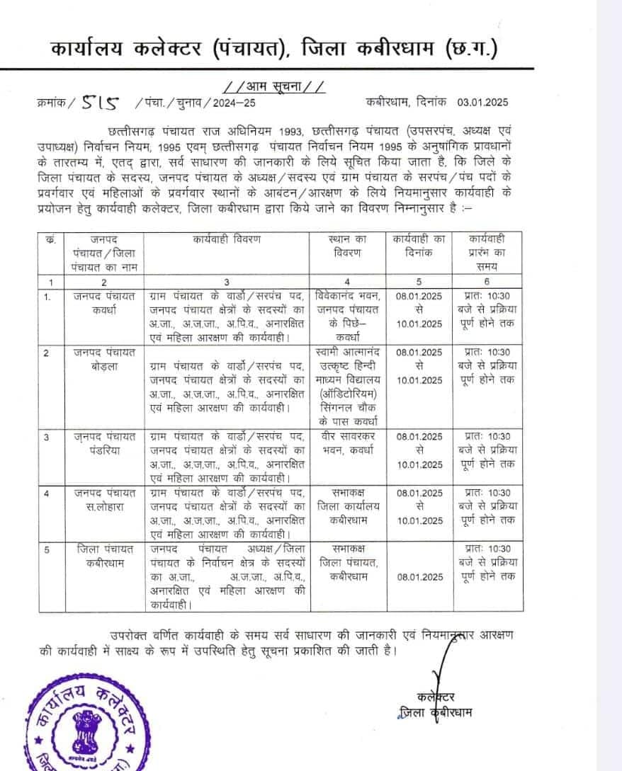 कवर्धा, 03 जनवरी 2025। छत्तीसगढ़ पंचायत राज अधिनियम, 1993 और पंचायत निर्वाचन नियम, 1995 के तहत जिला पंचायत सदस्य, जनपद पंचायत के अध्यक्ष, सदस्य, एवं ग्राम पंचायतों के पंच सरपंच के पदों के लिए प्रवर्गवार एवं महिलाओं के प्रवर्गवार आरक्षण की प्रक्रिया 8 जनवरी 2025 से शुरू होगी। यह प्रक्रिया 10 जनवरी 2025 तक जारी रहेगी। कलेक्टर श्री गोपाल वर्मा ने प्रत्येक जनपद पंचायत के लिए समय और स्थान तय किया गया है।