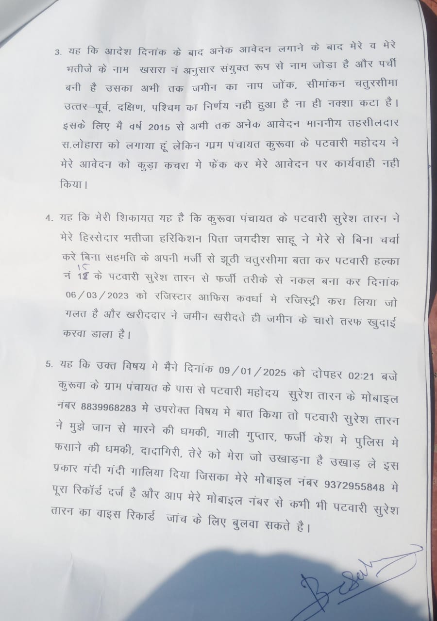 जबकि डिजिटल भारत हो रही है पर अधिकारी कर्मचारी डिजिटल का भरपूर दोहन कर रहे हैं बेलगाम राजस्व विभाग में मुख्य कड़ी पटवारी है और पटवारी के कृत्य से हर किसान परेशान हैं जीस अंदाज में पटवारी आडियो वायरल में पेश आ रहा है उससे साफ है पटवारी को तनिक भी आचरण में कही भी लोकसेवक का नहीं लगता पिडित किसान सभ्यता से बात कर रहा है और बता रहा है उनके खेत को दुसरे के नाम पर रजिस्ट्री भी कर दी गई और नामात्रण भी कर दिया ऊनके अनुपस्थिति में अब ये मामला सुनने में बहुत सरल है पर इतनी बड़ी भृष्ट्राचार आज के डिजिटल जमाना में कैसे संभव है पर हो गया और अब तक इस मामले में कोई कार्यवाही जिला प्रशासन नहीं किया है? इससे साफ है कदाचार करने की प्रवृत्ति लोकसेवक में वृद्धि होना स्वाभाविक है जबकी प्राईमरी तौर पर जारी आडियो से साफ है लोकसेवक अपने आचारन को निर्धारित आचरण प्रस्तुत नहीं कर रहा है लिहाजा कार्यवाही हो जाना चाहिए था ।
