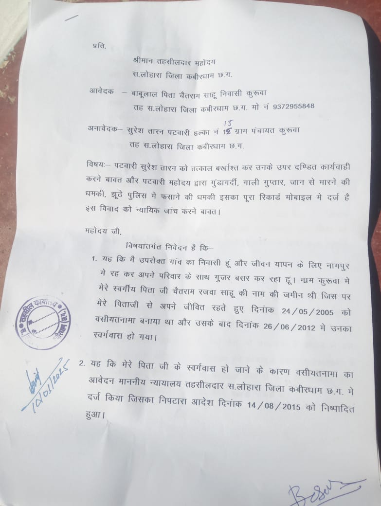 किसान को गाली-गलौज कवर्धा आने पर देखने की धमकी पटवारी द्वारा खुलें आम करना प्रशासन मौन क्या गृहमंत्री के जिला बेलगाम हो रहा है।