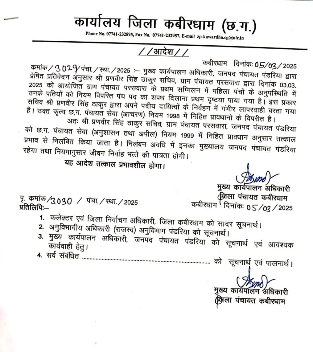 कवर्धा, 05 मार्च 2025। जनपद पंचायत पंडरिया के ग्राम पंचायत परसवारा में नवनिर्वाचित पंच प्रतिनिधियों के प्रथम सम्मिलन में महिला पंचों के अनुपस्थिति में उनके पतियों को नियम विरुद्ध पंच पद का शपथ दिलाये जाने के कारण मुख्य कार्यपालन अधिकारी जिला पंचायत (सीईओ) कबीरधाम श्री अजय कुमार त्रिपाठी द्वारा ग्राम पंचायत परसवारा के सचिव श्री प्रणीवर सिंह ठाकुर को तत्काल प्रभाव से निलंबित किया गया है।