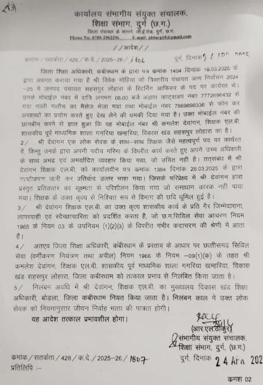 जिला शिक्षा अधिकारी कबीरधाम की रिपोर्ट के आधार पर देवांगन को छत्तीसगढ़ सिविल सेवा (वर्गीकरण, नियंत्रण तथा अपील) नियम 1966 के तहत तत्काल प्रभाव से निलंबित किया गया है। आदेश में स्पष्ट किया गया है कि निलंबन अवधि में उन्हें नियमानुसार जीवन निर्वाह भत्ता मिलेगा, लेकिन मुख्यालय बोडला में रहना होगा।