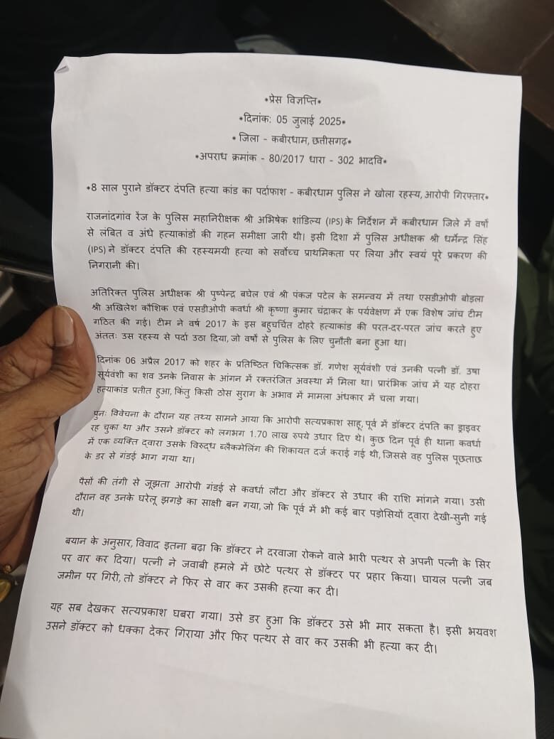 8 साल पुराने डॉक्टर दंपति हत्या कांड का पर्दाफाश – कबीरधाम पुलिस ने खोला रहस्य, आरोपी गिरफ्तार