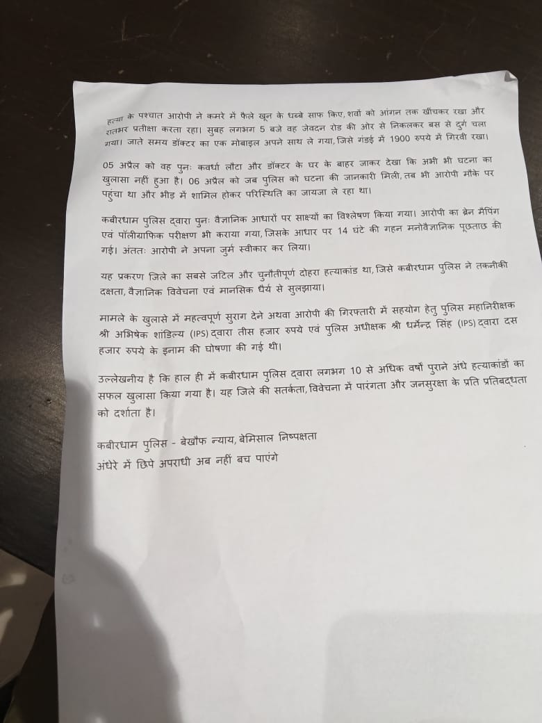 उल्लेखनीय है कि हाल ही में कबीरधाम पुलिस द्वारा लगभग 10 से अधिक वर्षों पुराने अंधे हत्याकांडों का सफल खुलासा किया गया है। यह जिले की सतर्कता, विवेचना में पारंगता और जनसुरक्षा के प्रति प्रतिबद्धता को दर्शाता है।